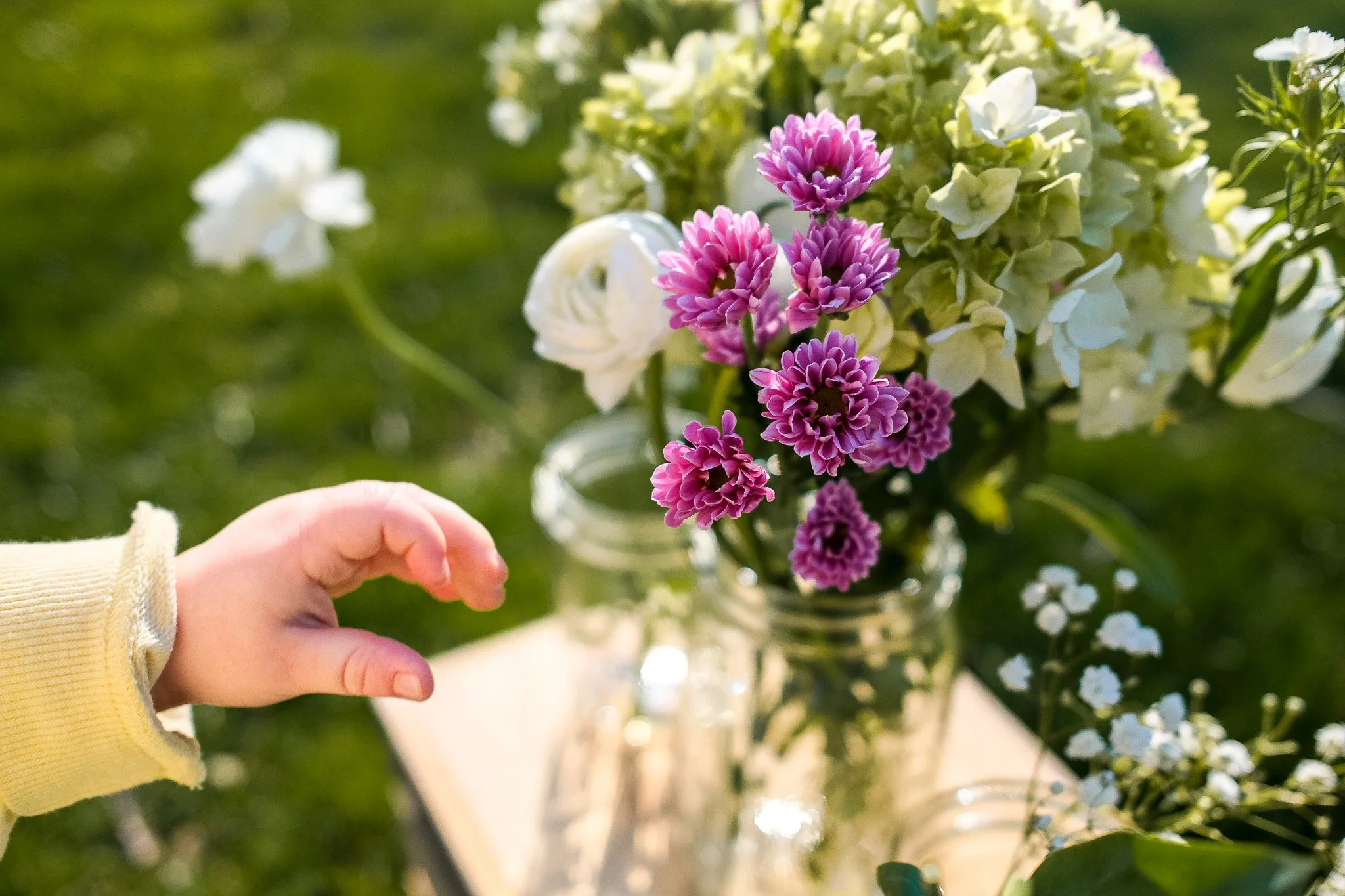 Your little ones choose their stems. You build the bouquet together. This is where the session really starts. The camera is already going, but there's nothing to perform. Just pick flowers.